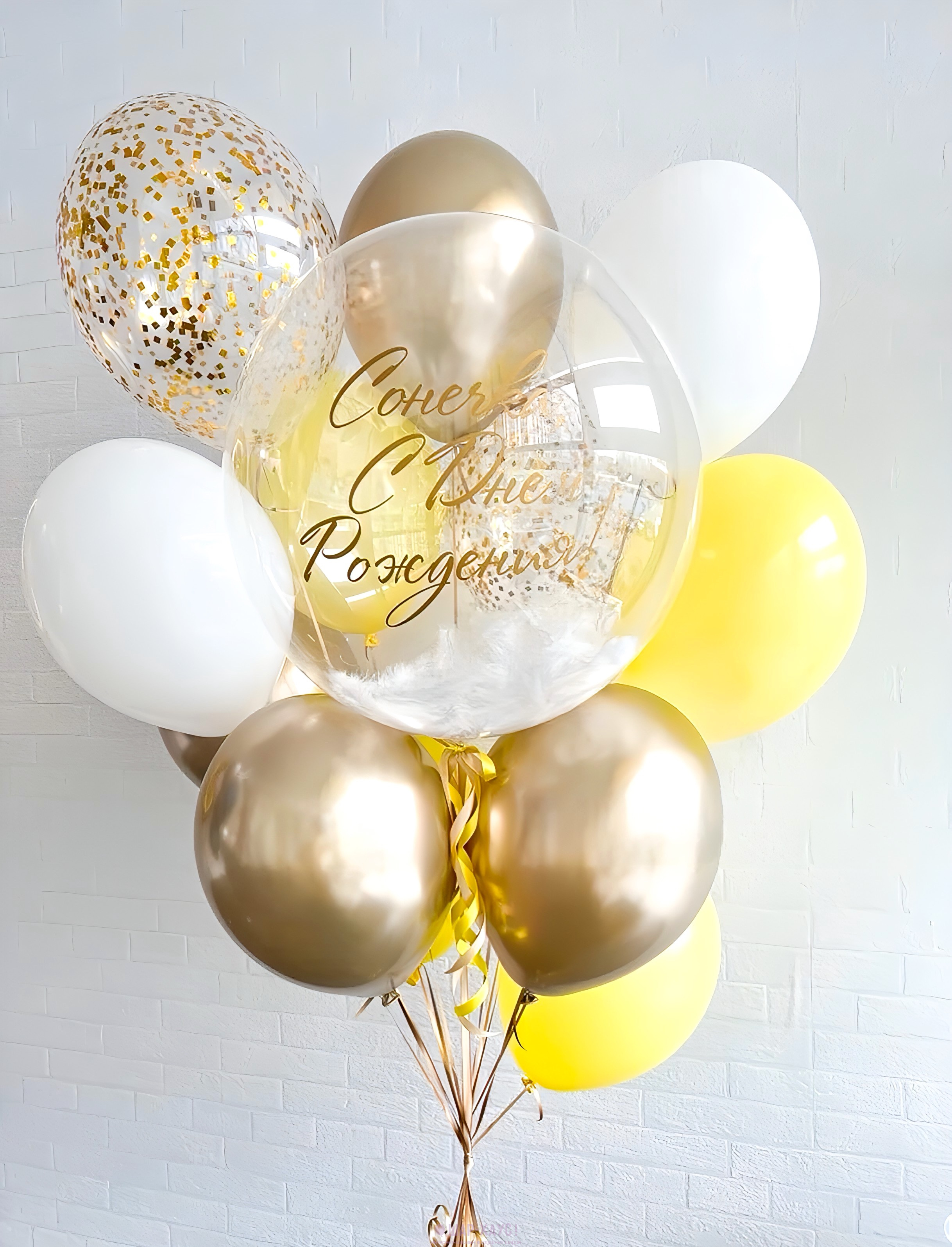 • 1 Воздушный шар Бабл с перьями внутри и надписью на выбор (55 см)
