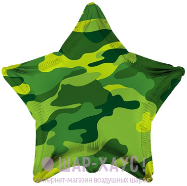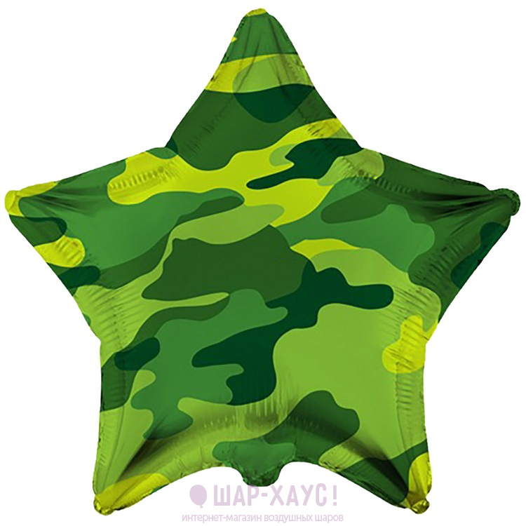 Фольгированный шар в форме звезды с зеленым камуфляжным рисунком в двух оттенках будет уместен для поздравления с 23 февраля и праздниками отдельных родов войск! Размер шара в надуве: 45 см. Выполнен из миларовой пленки, благодаря чему шар летает несколько дней.