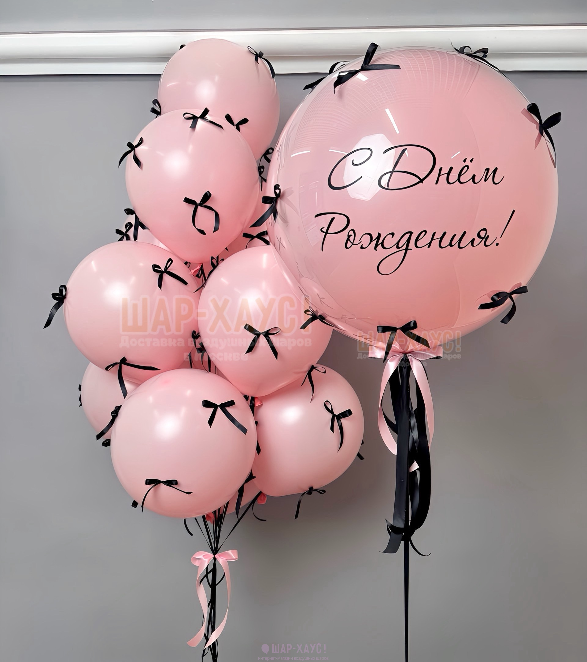 • 1 Фонтан из 11 латексных шаров розовый пастель с черными бантиками (45 см)