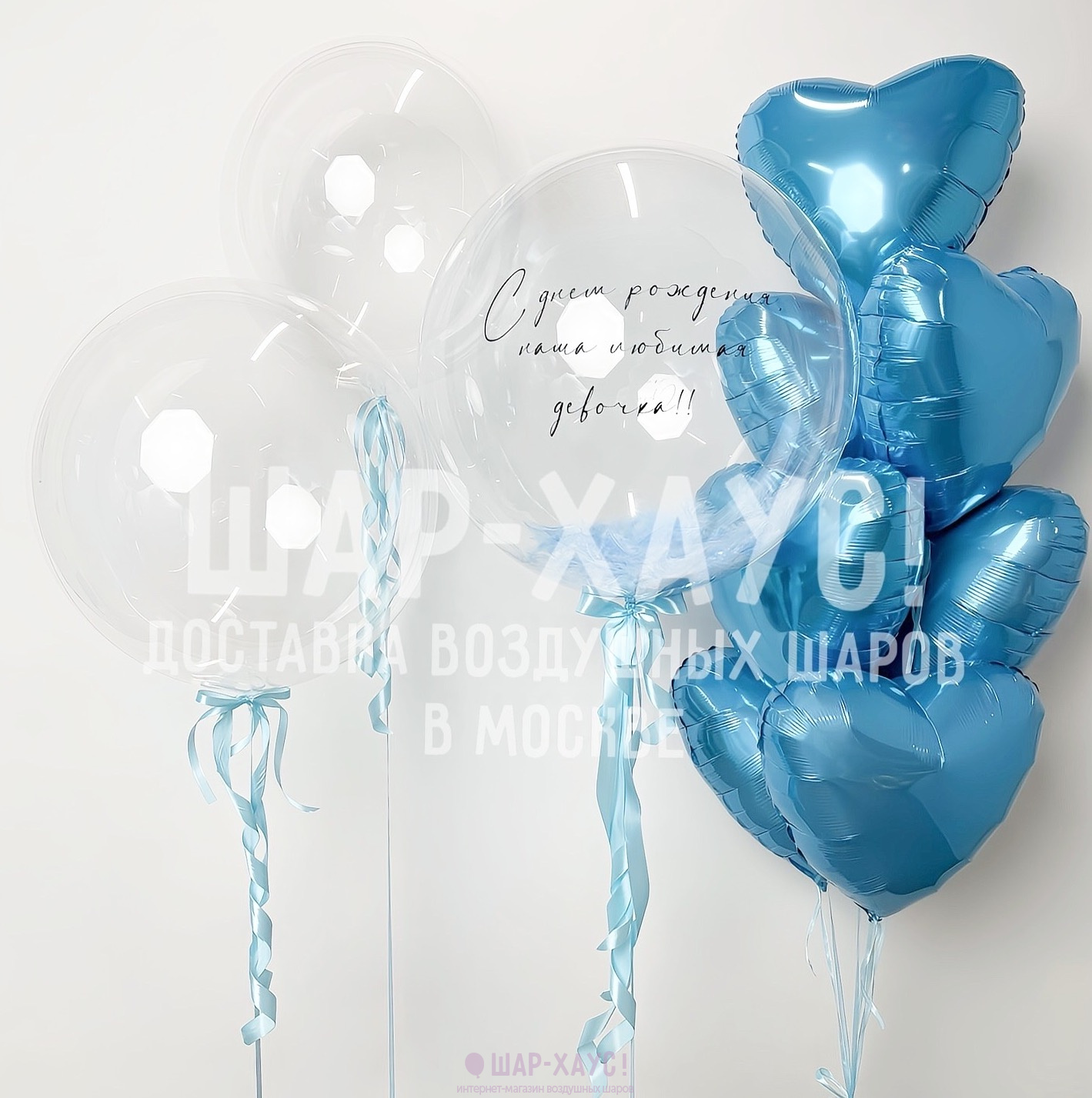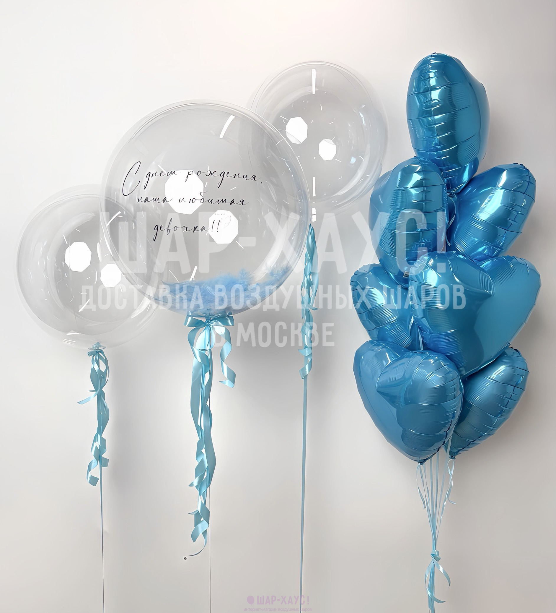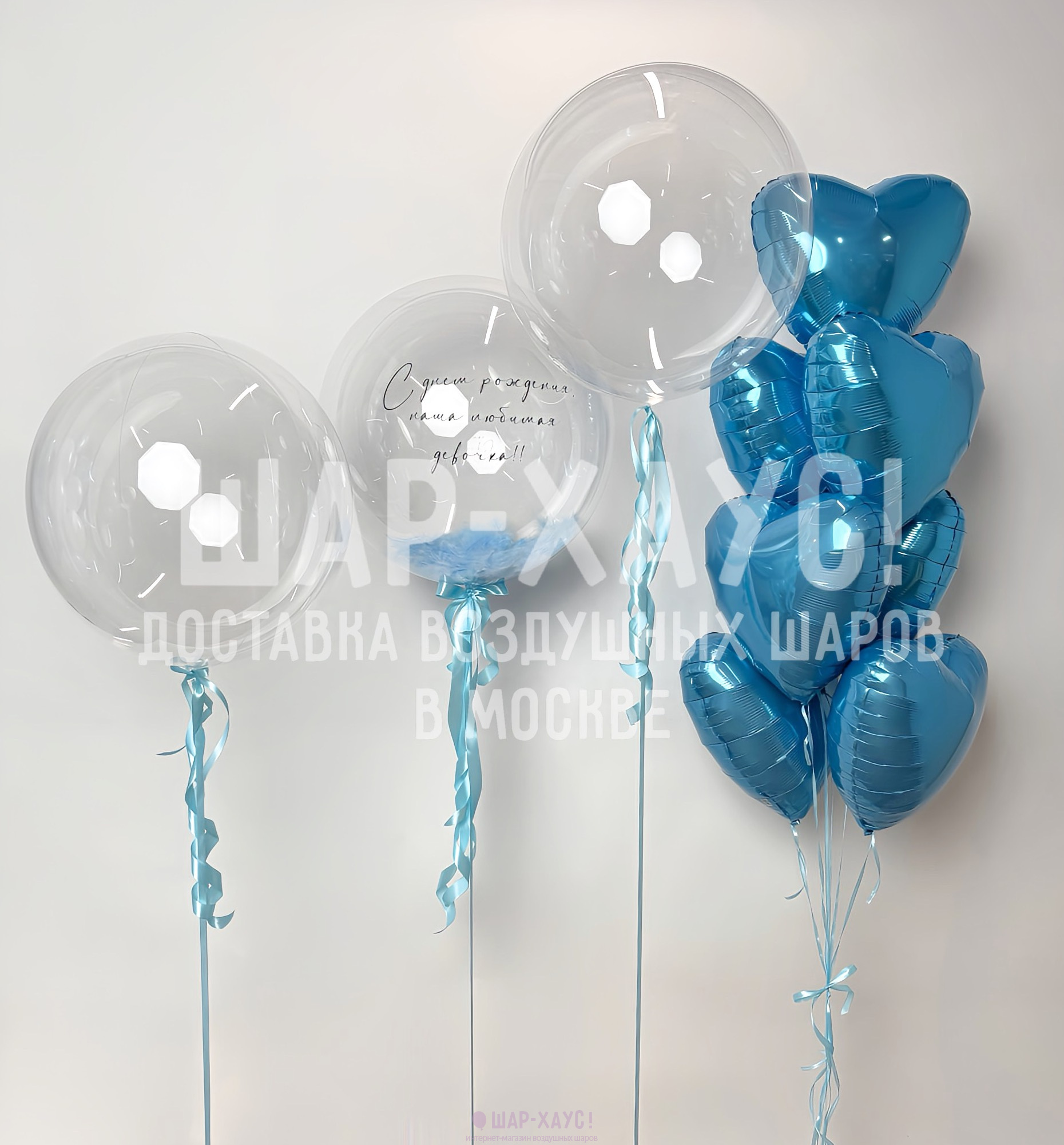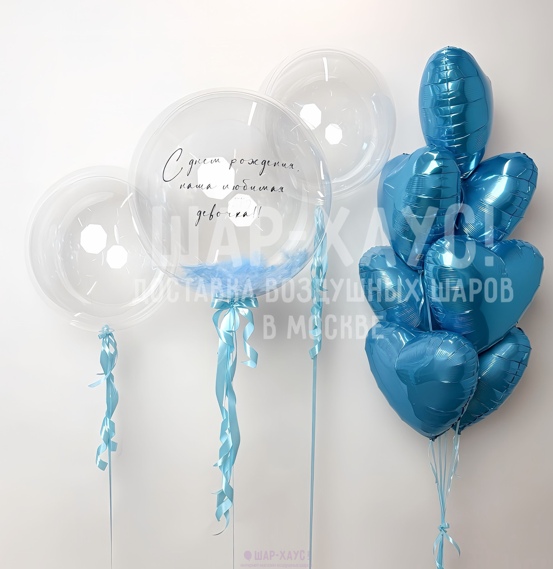 • 1 Прозрачный шар Бабл с голубыми перьями внутри и надписью на выбор (50 см)