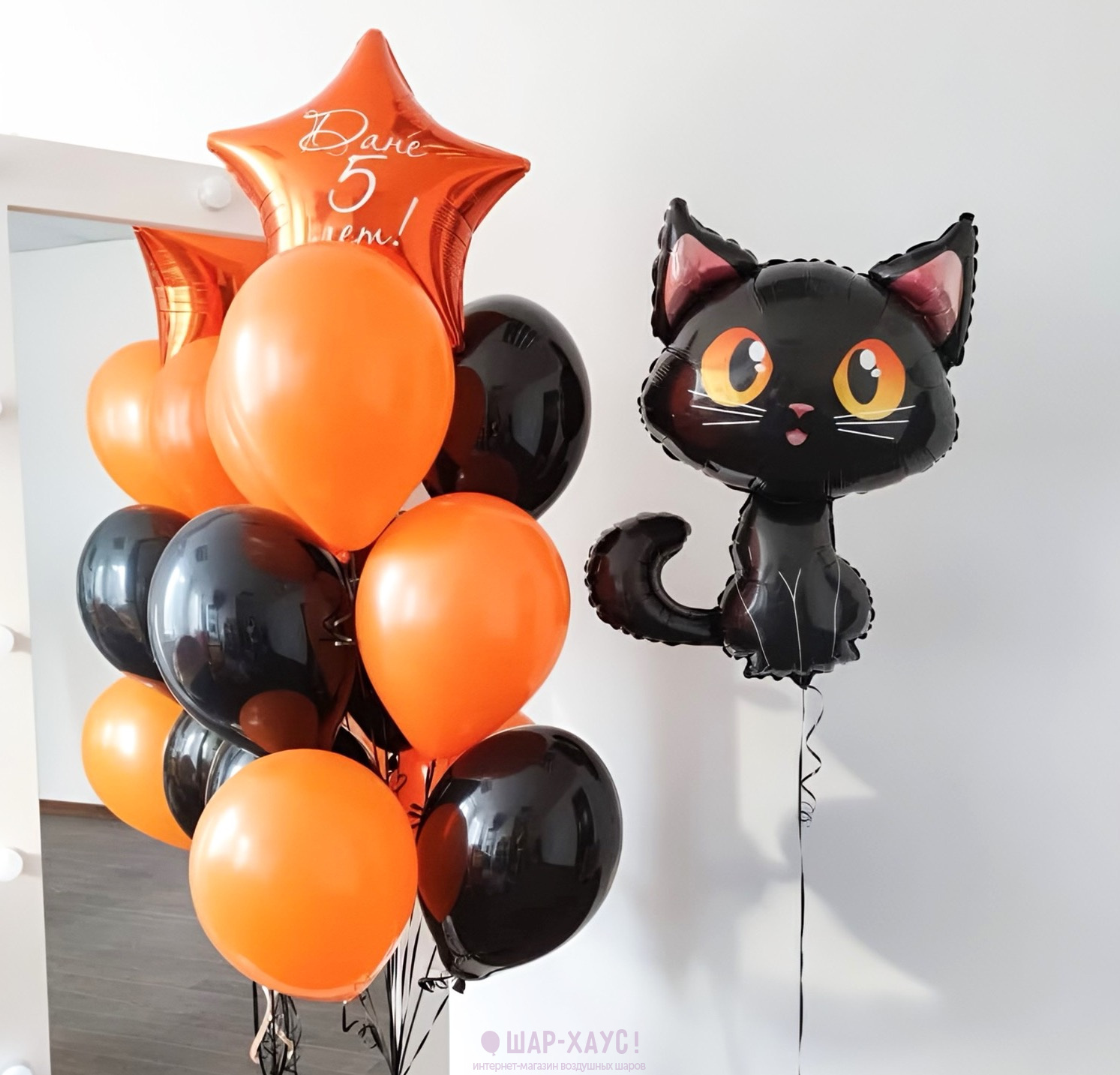 Композиция из шаров "Черный кот и оранжевый фонтан"
