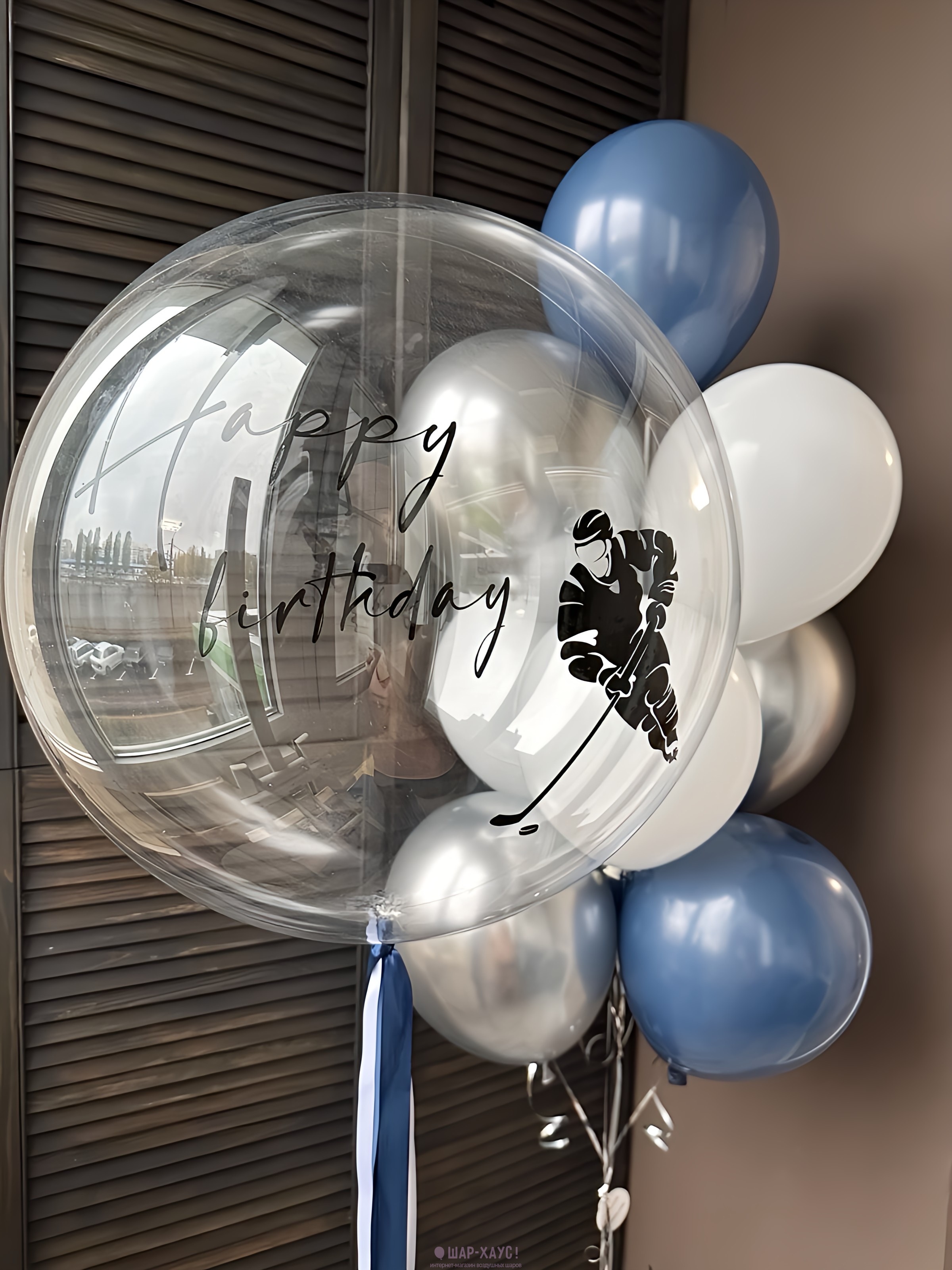 • 1 Воздушный шар Бабл с конфетти-крошкой серебро, надписью и рисунком на выбор (61 см)