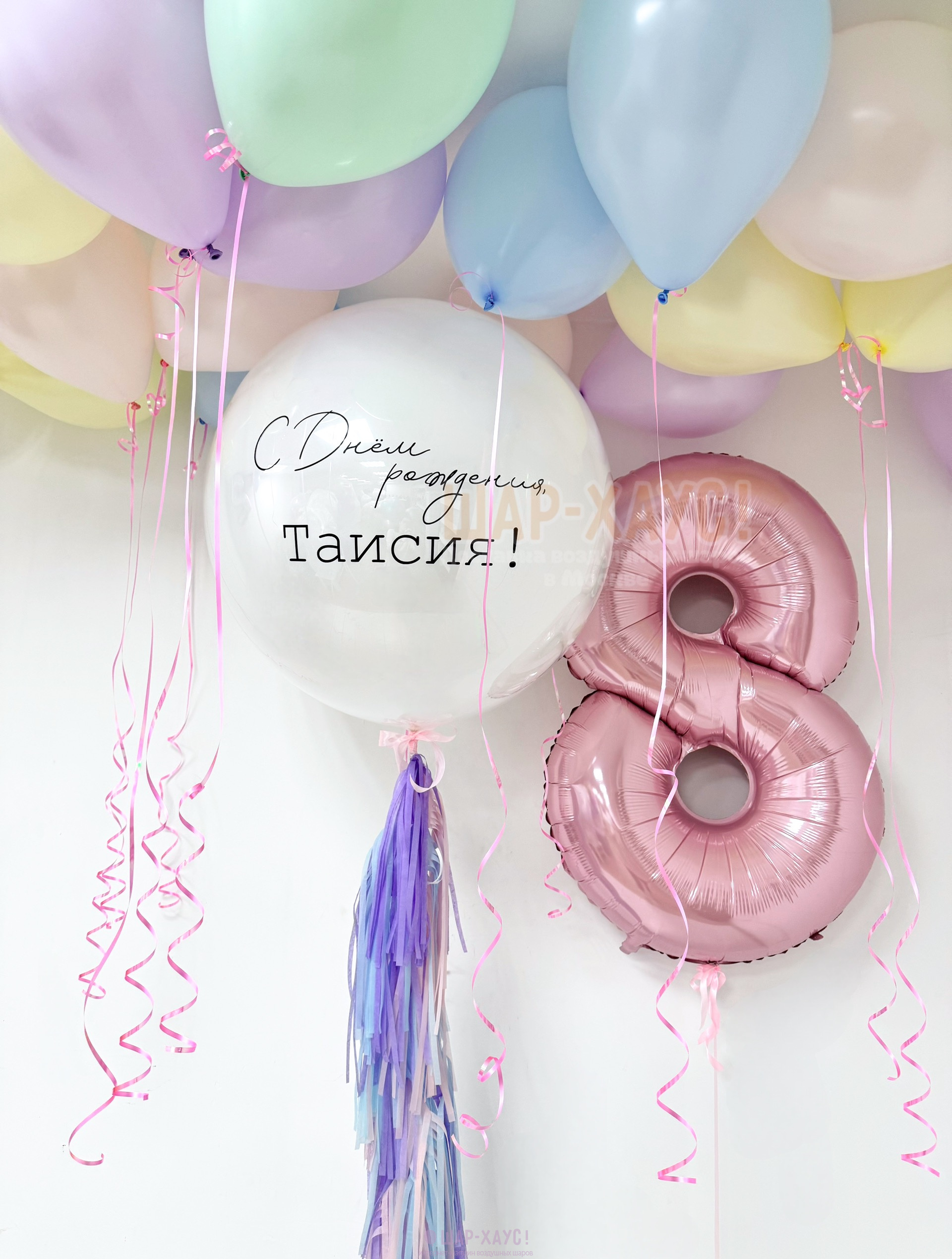 • 1 Стеклянный воздушный шар Дабл стафф с гирляндой тассел и надписью на выбор (60 см)