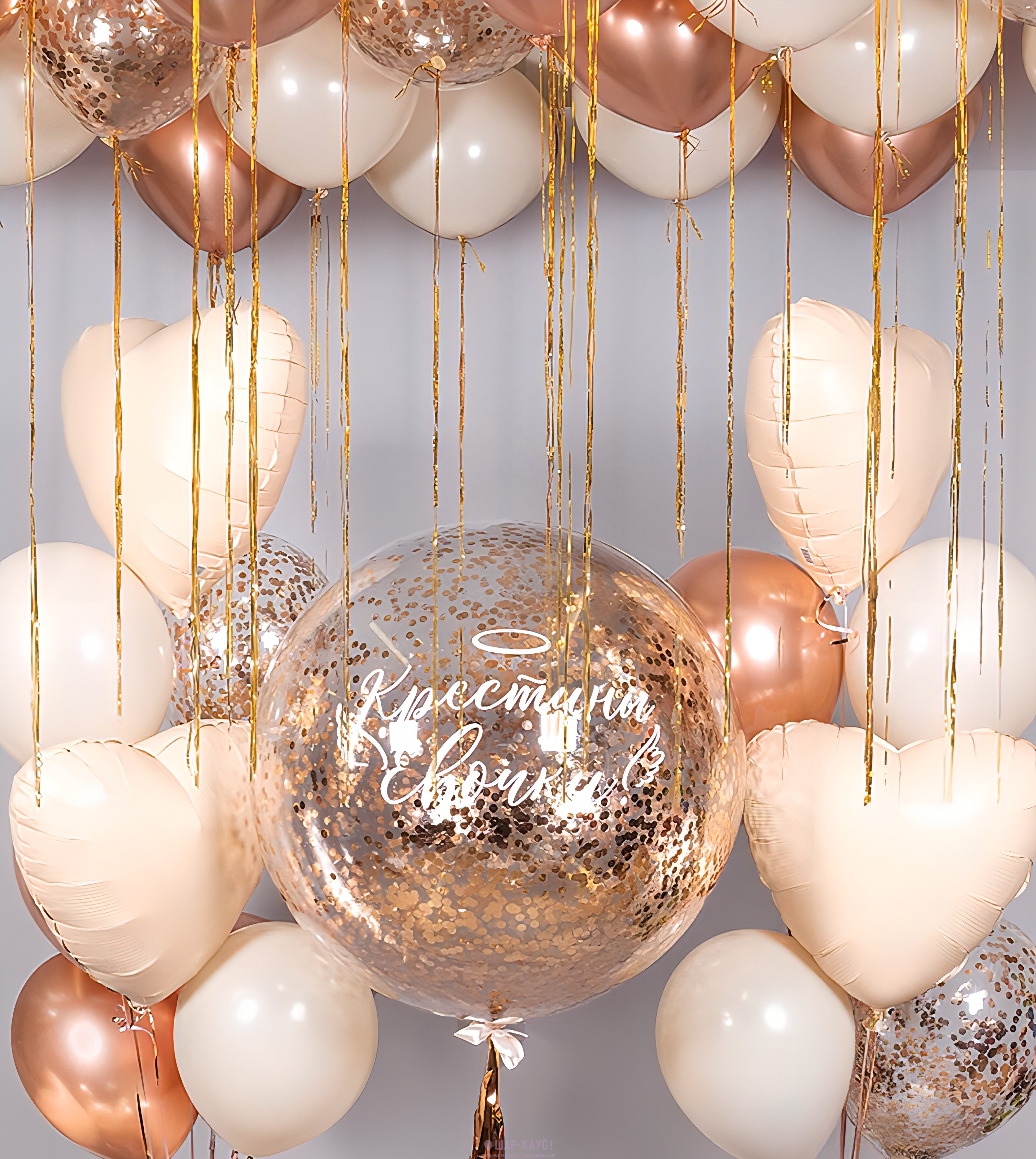 • 1 Воздушный шар Бабл с конфетти светлое золото внутри и надписью на выбор (65 см)