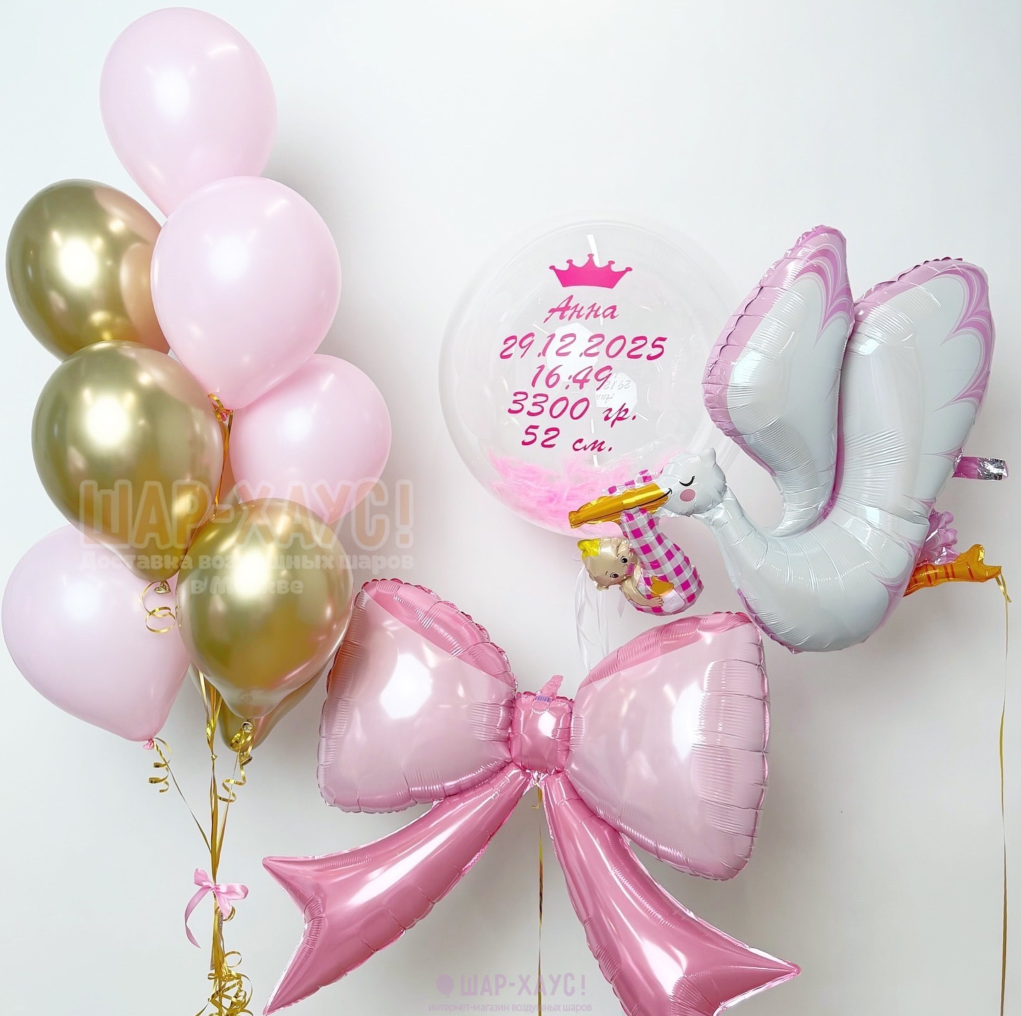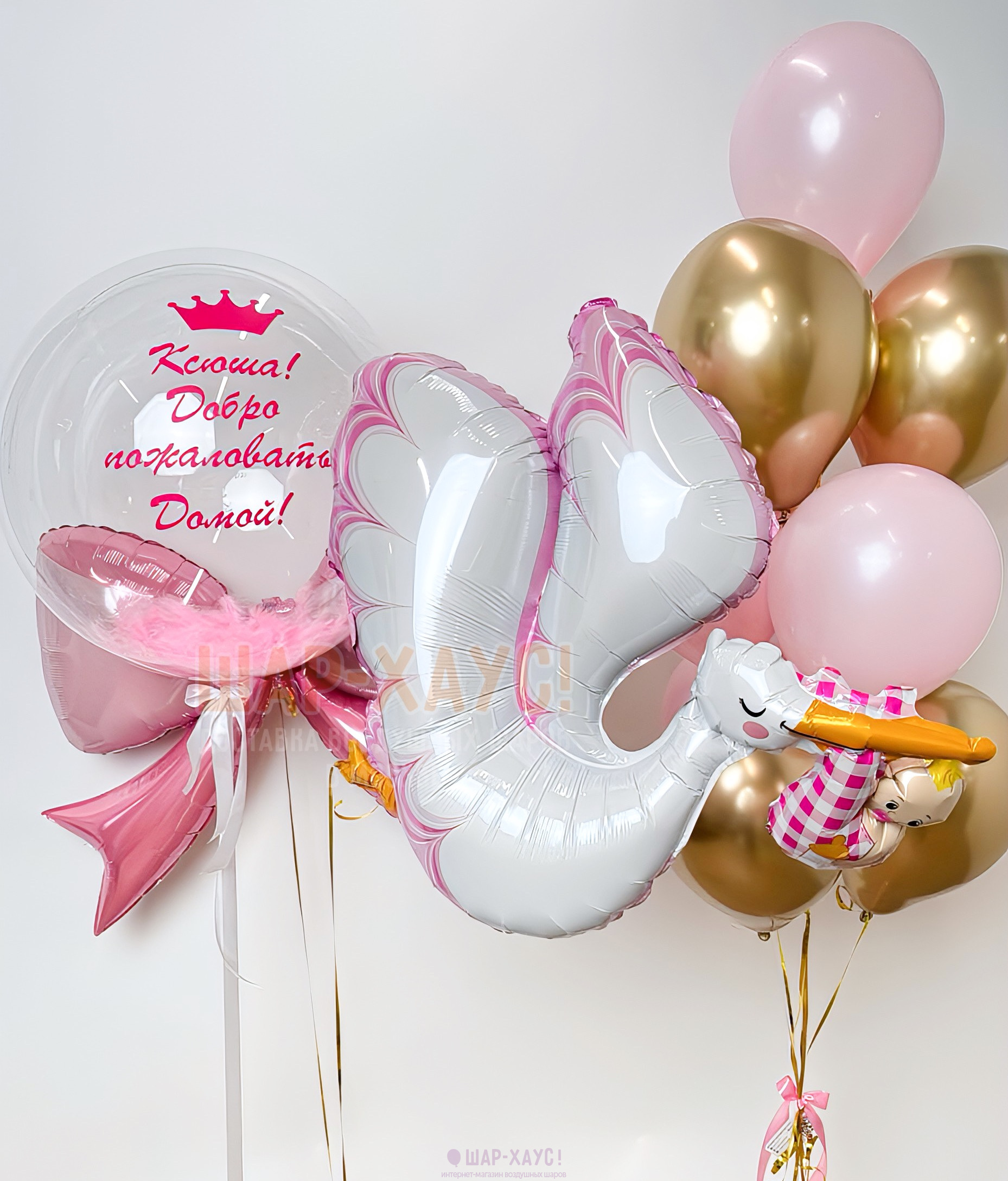 Композиция из шаров на выписку "Аист девочке"