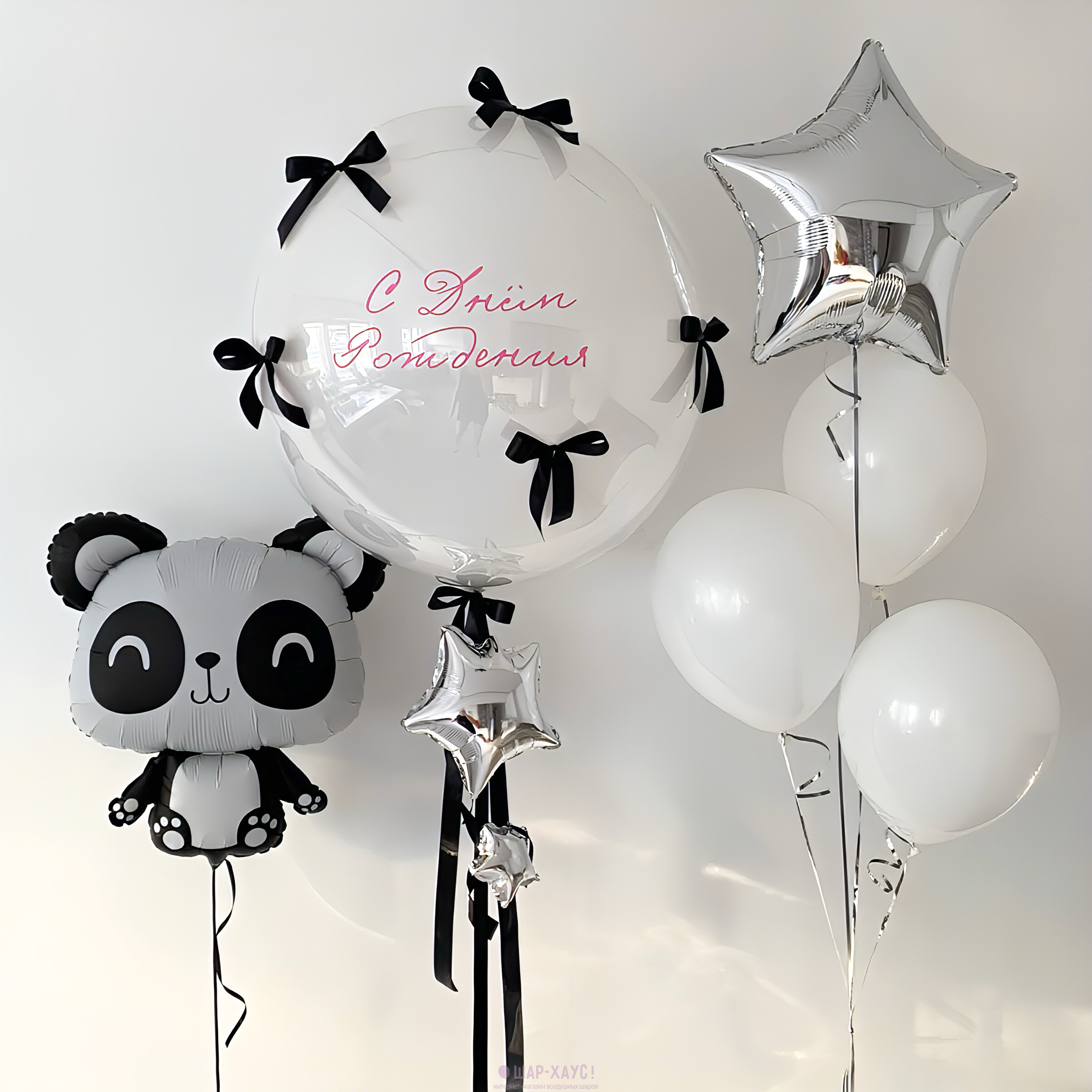 • 1 Стеклянный воздушный шар Дабл стафф с бантиками, надписью на выбор и декоративными звездами (65 см)