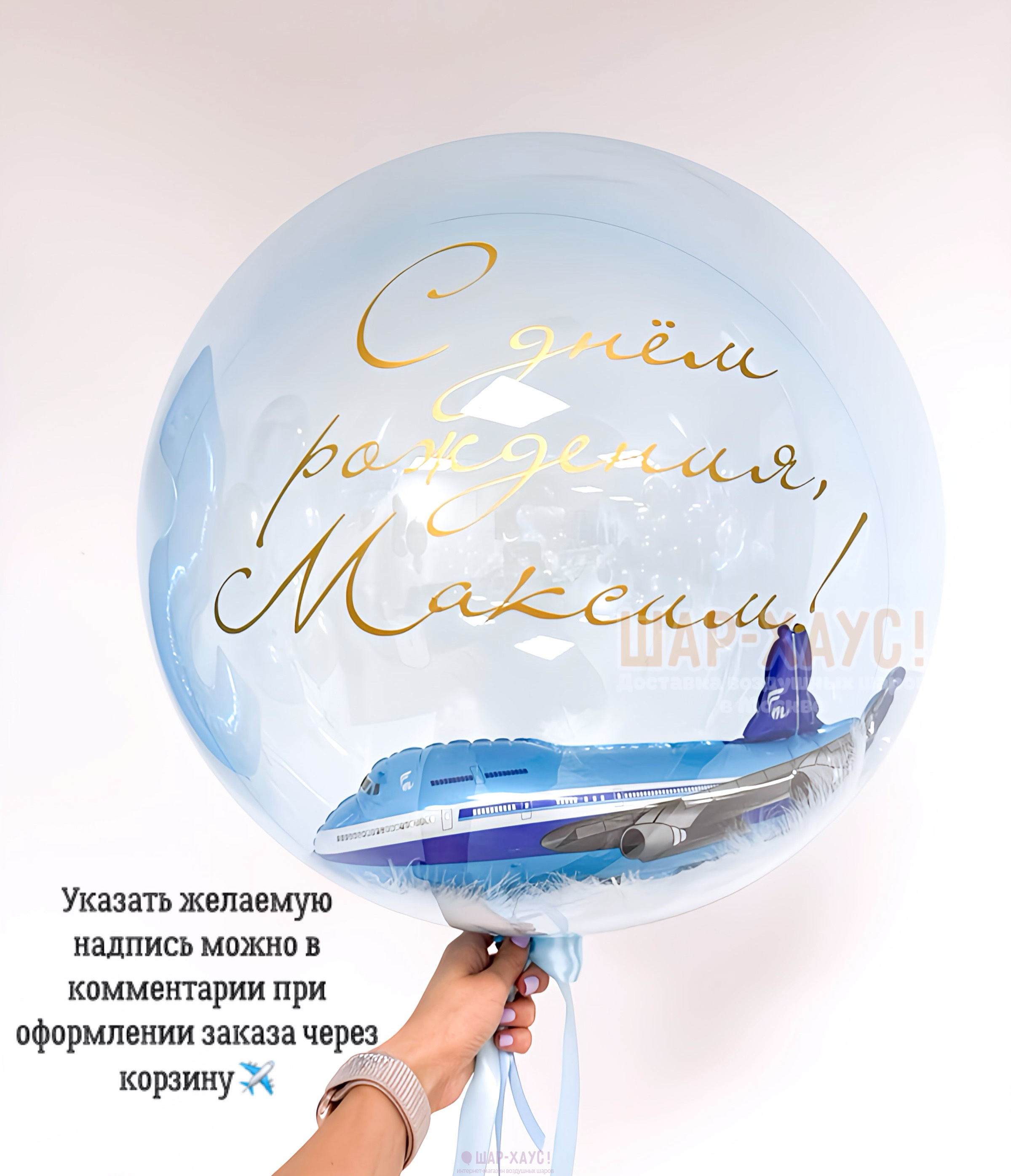 • Шар Бабл с надписью на выбор, самолетом и перьями внутри (65 см)