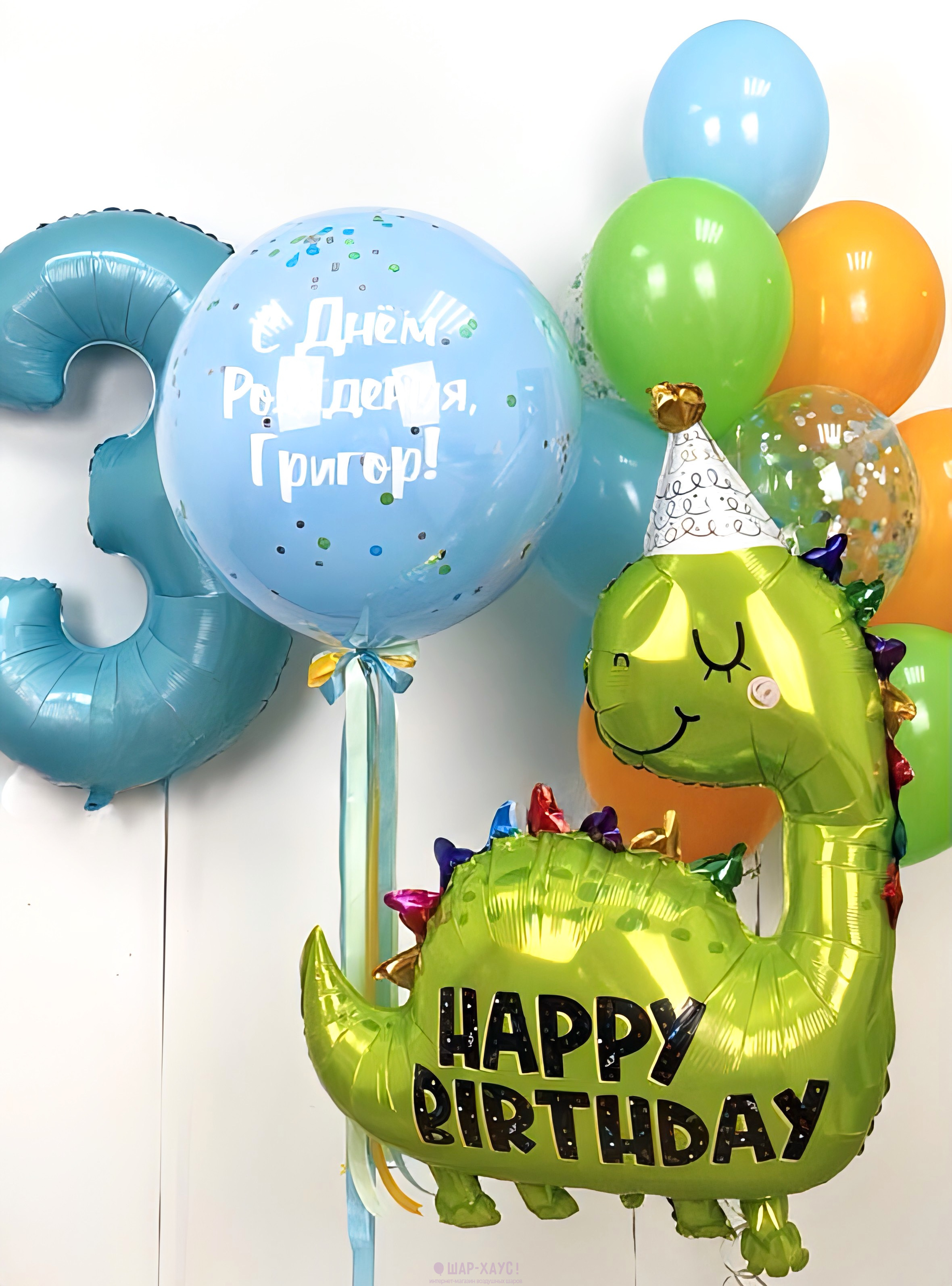 Композиция из шаров "Поздравление от динозаврика в колпаке"