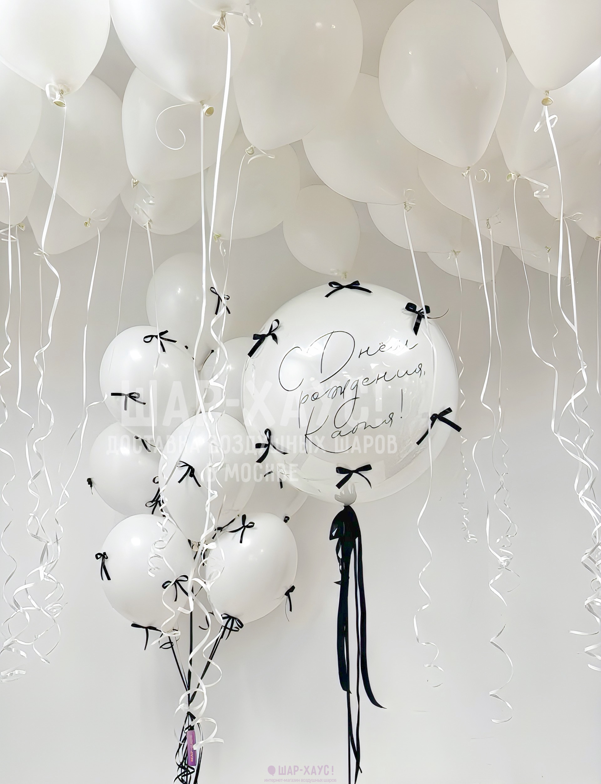 Вы можете изменить состав и цвет шариков в данной композиции, цвет бантиков, а также индивидуальную надпись.