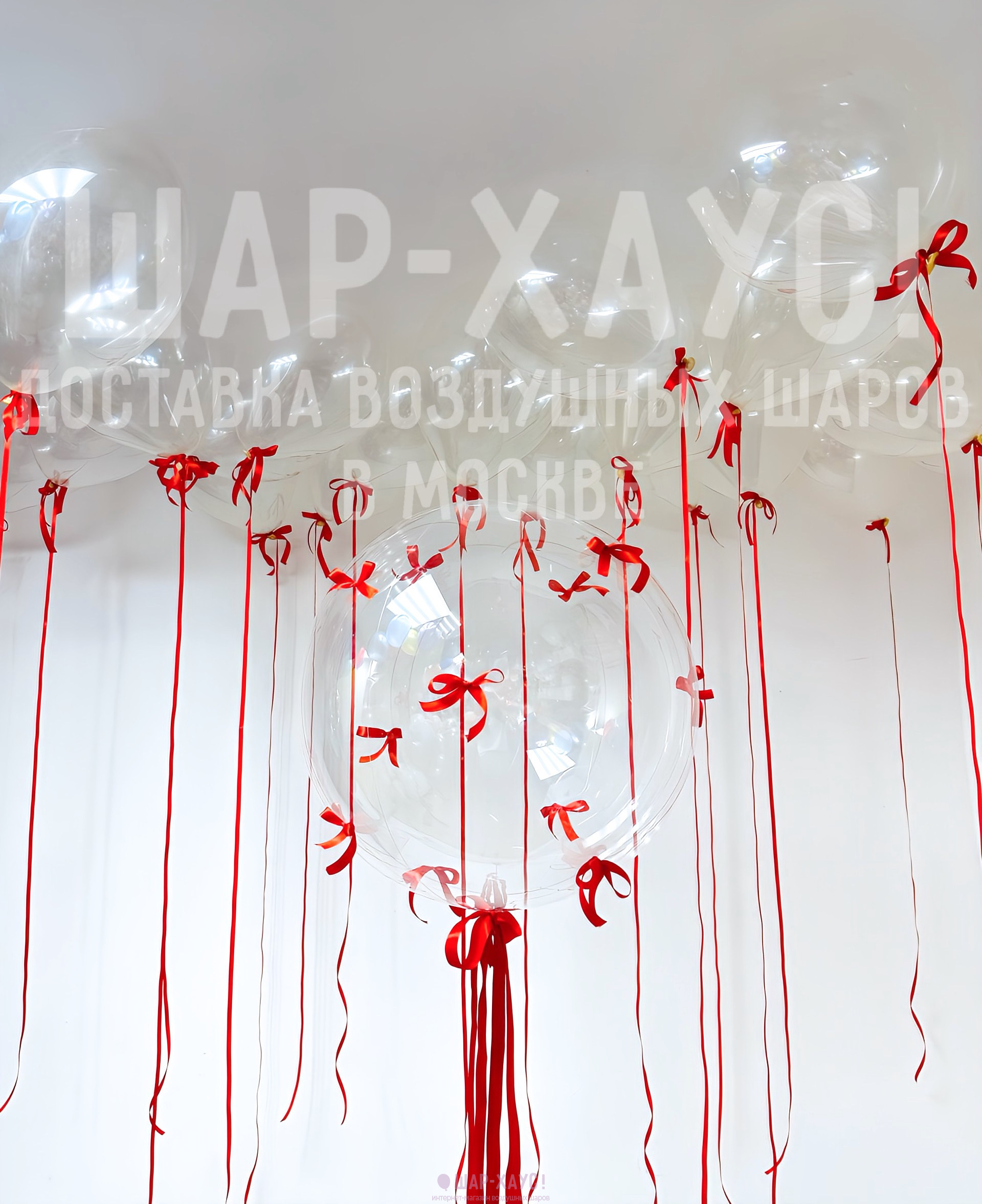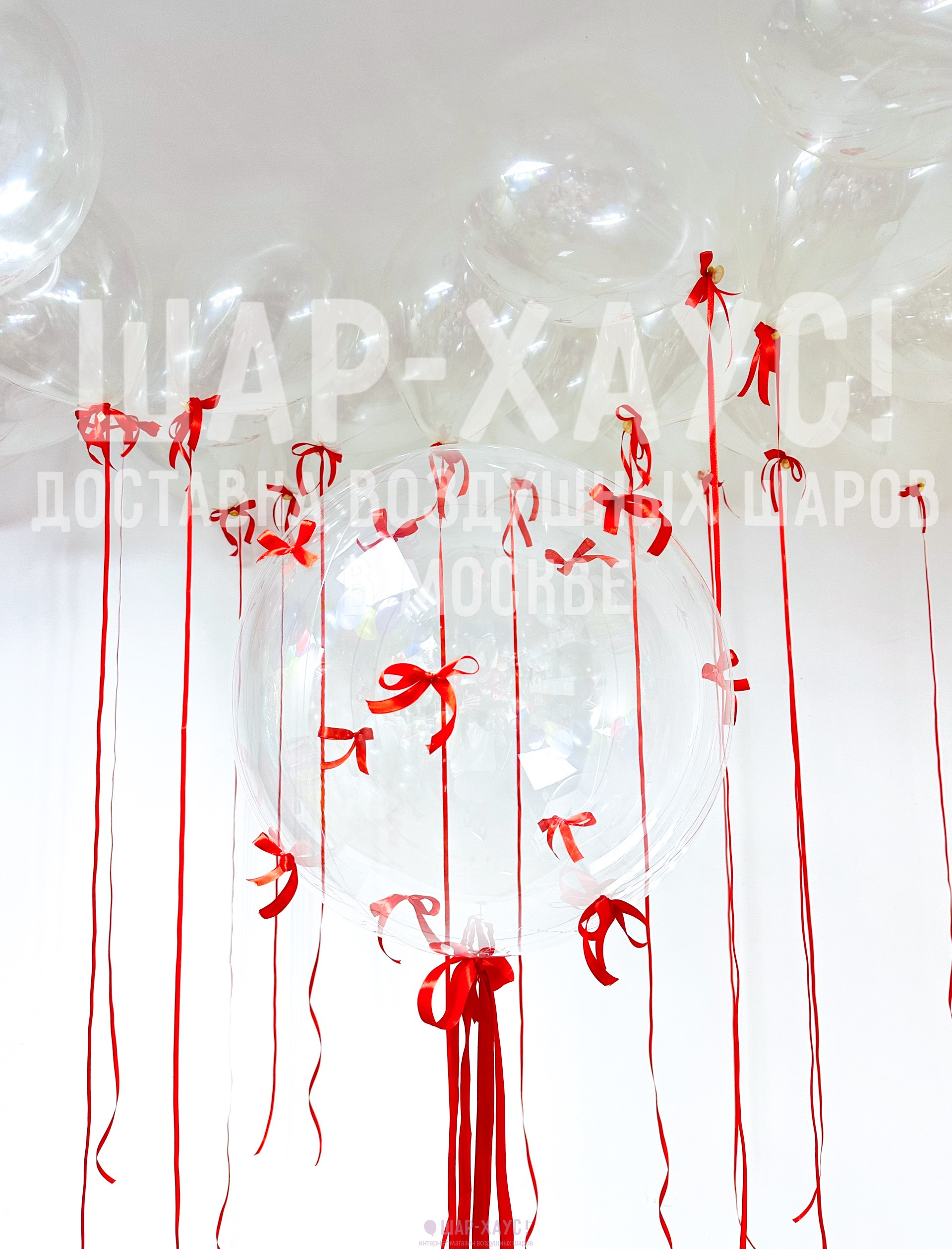 • 20 Прозрачных шаров под потолок на красных лентах, с бантиком у основания (35 см)