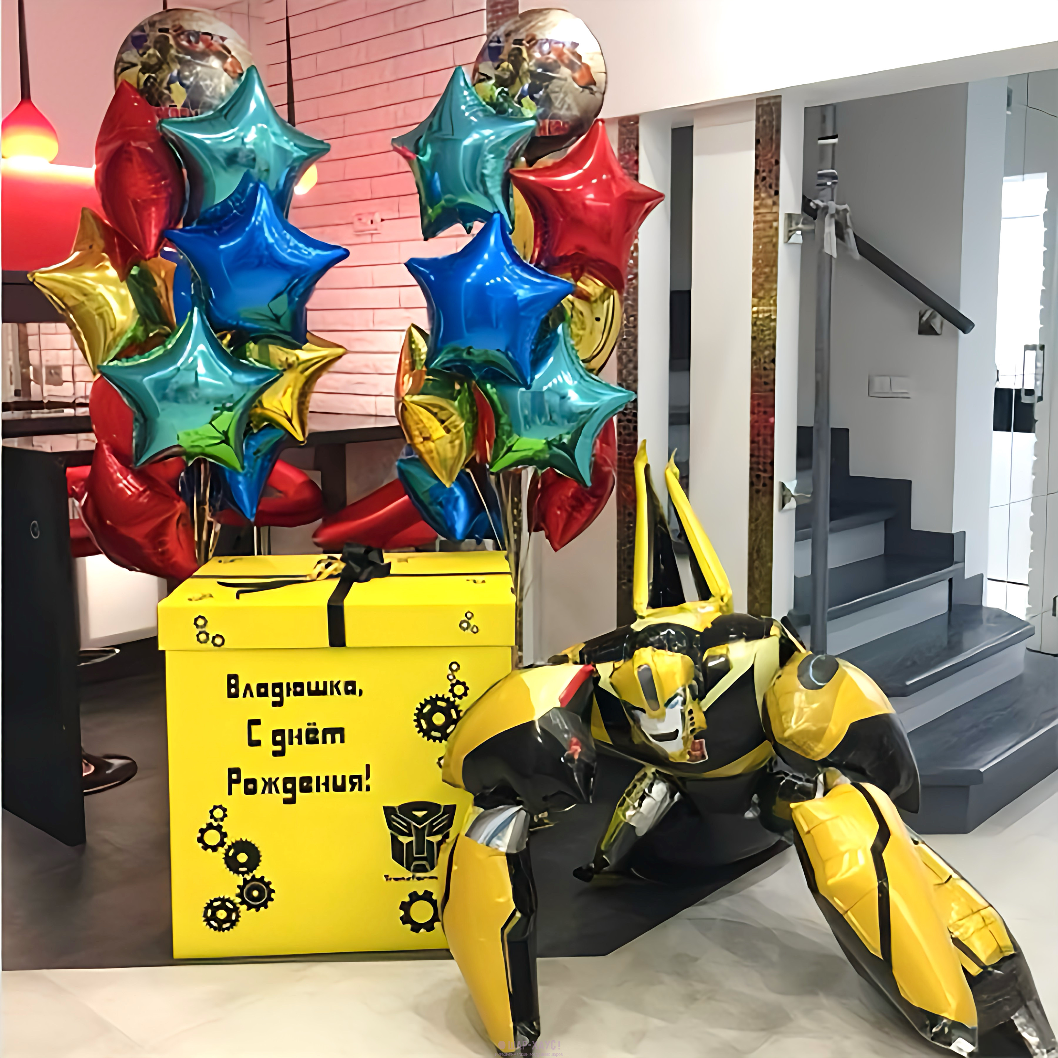 Композиция из шаров с коробкой "Трансмормер Бамблби и звезды"