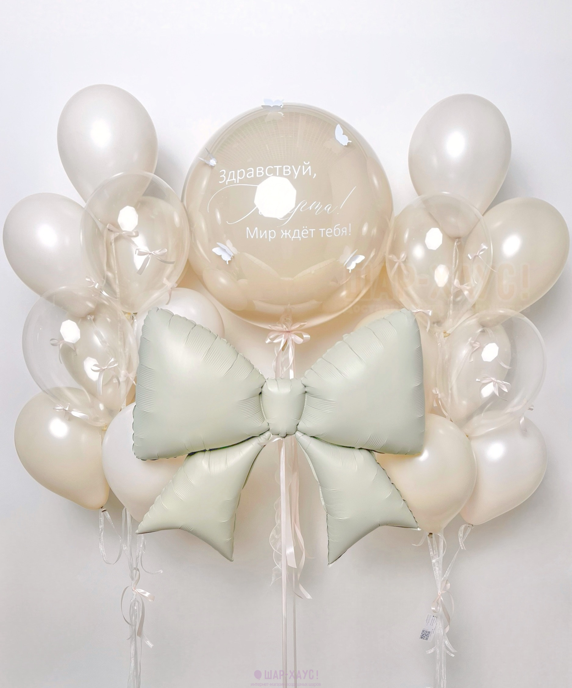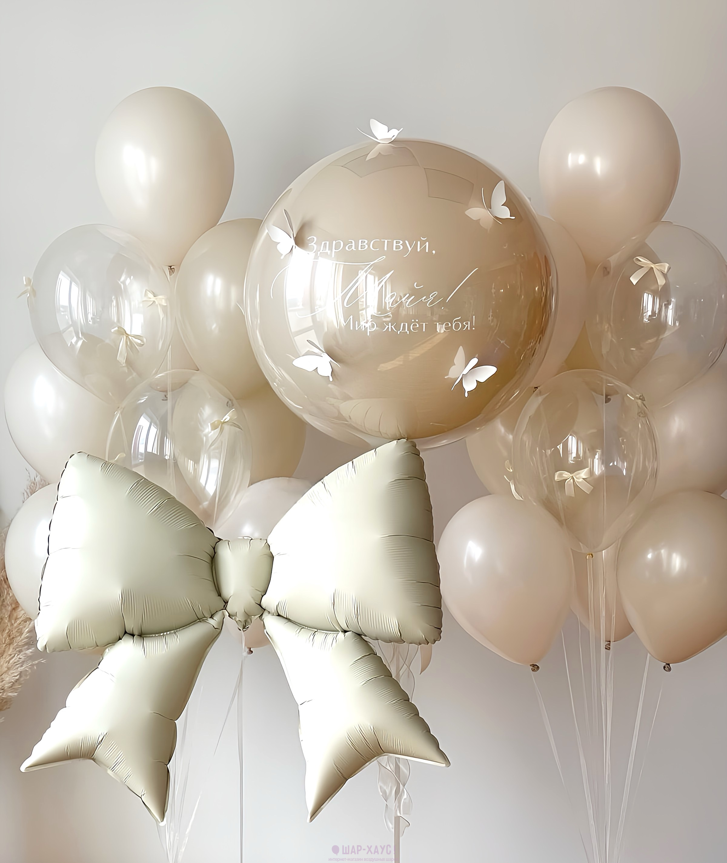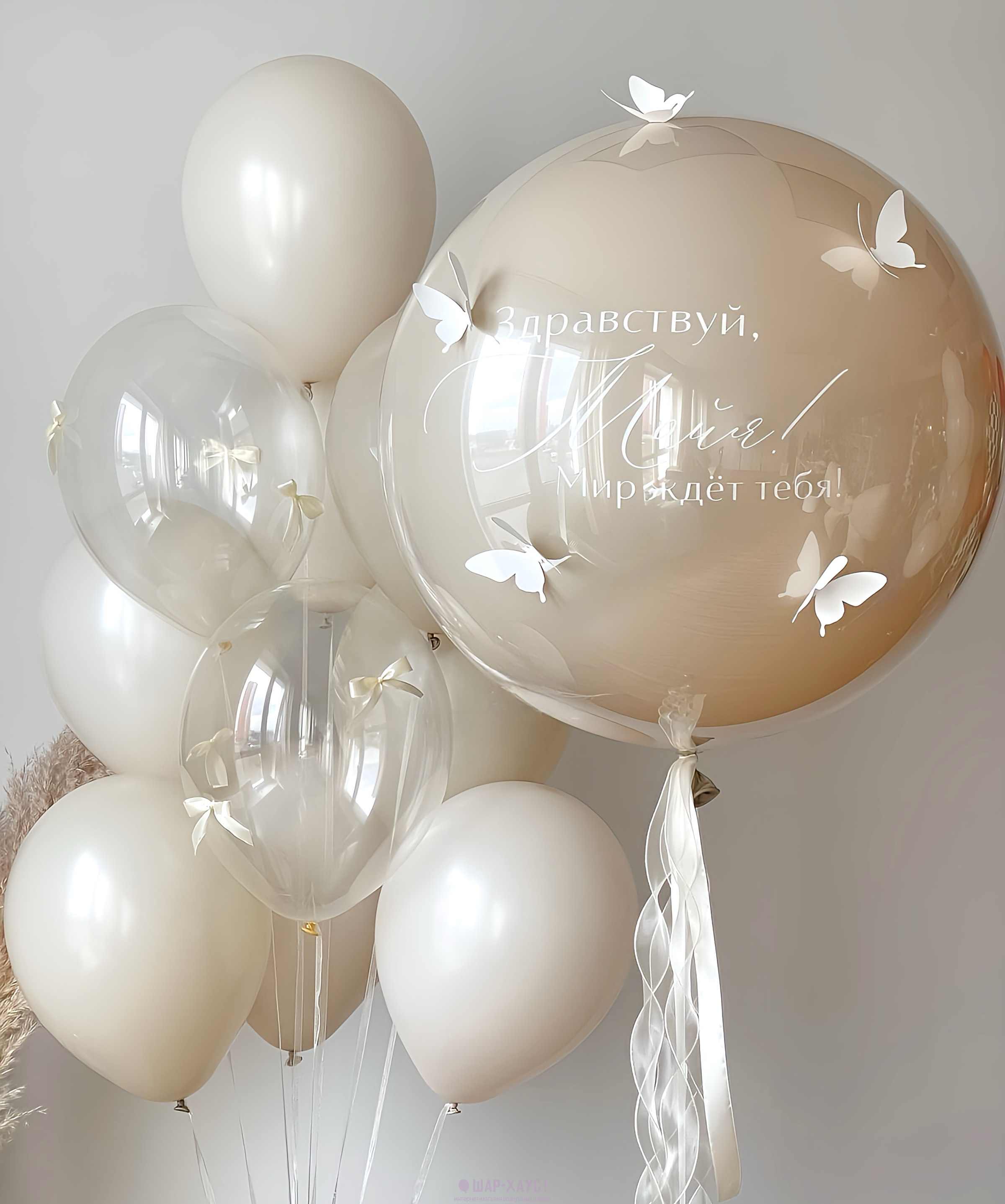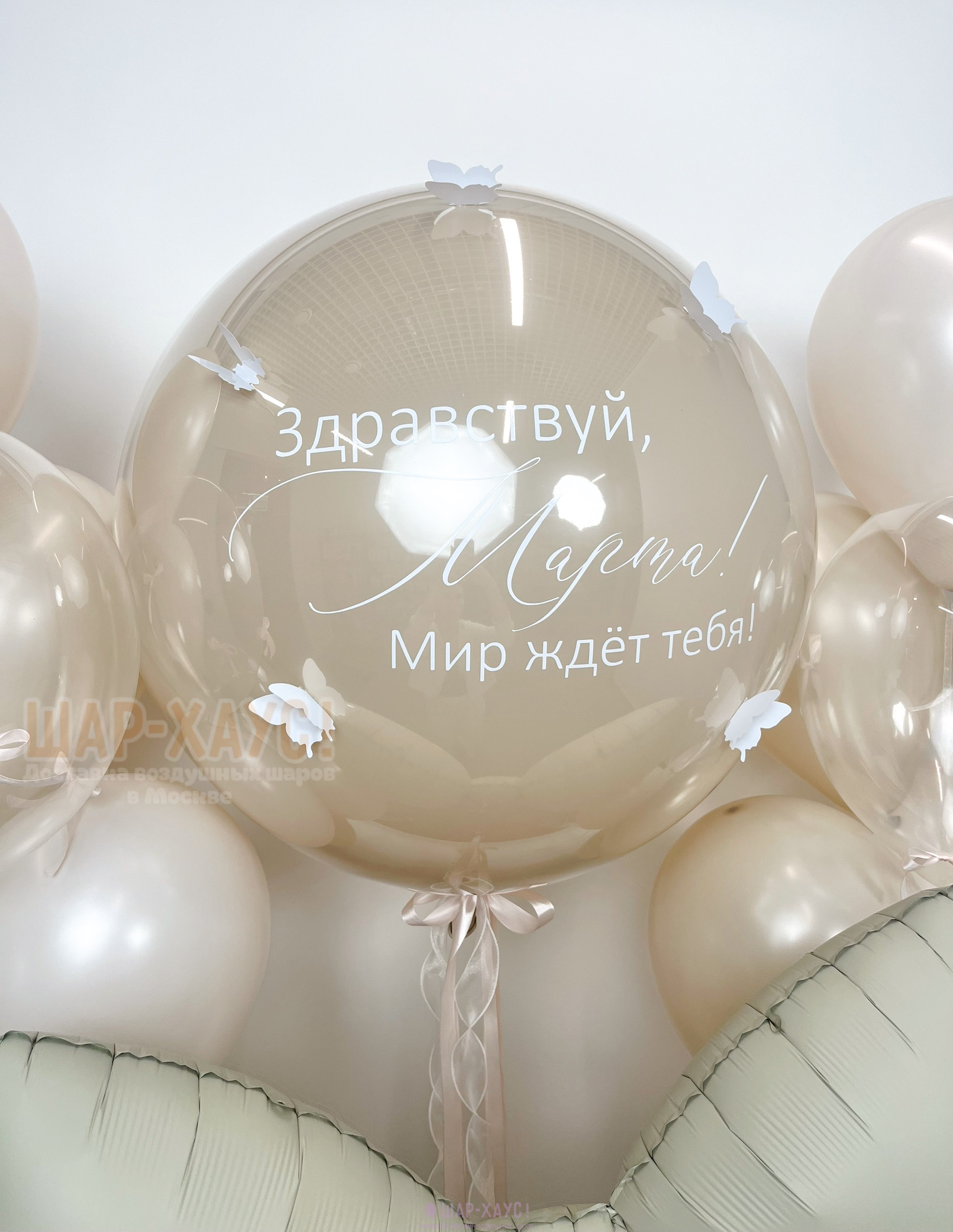 • 1 Стеклянный воздушный шар Дабл Стафф с надписью на выбор и бабочками (61 см)