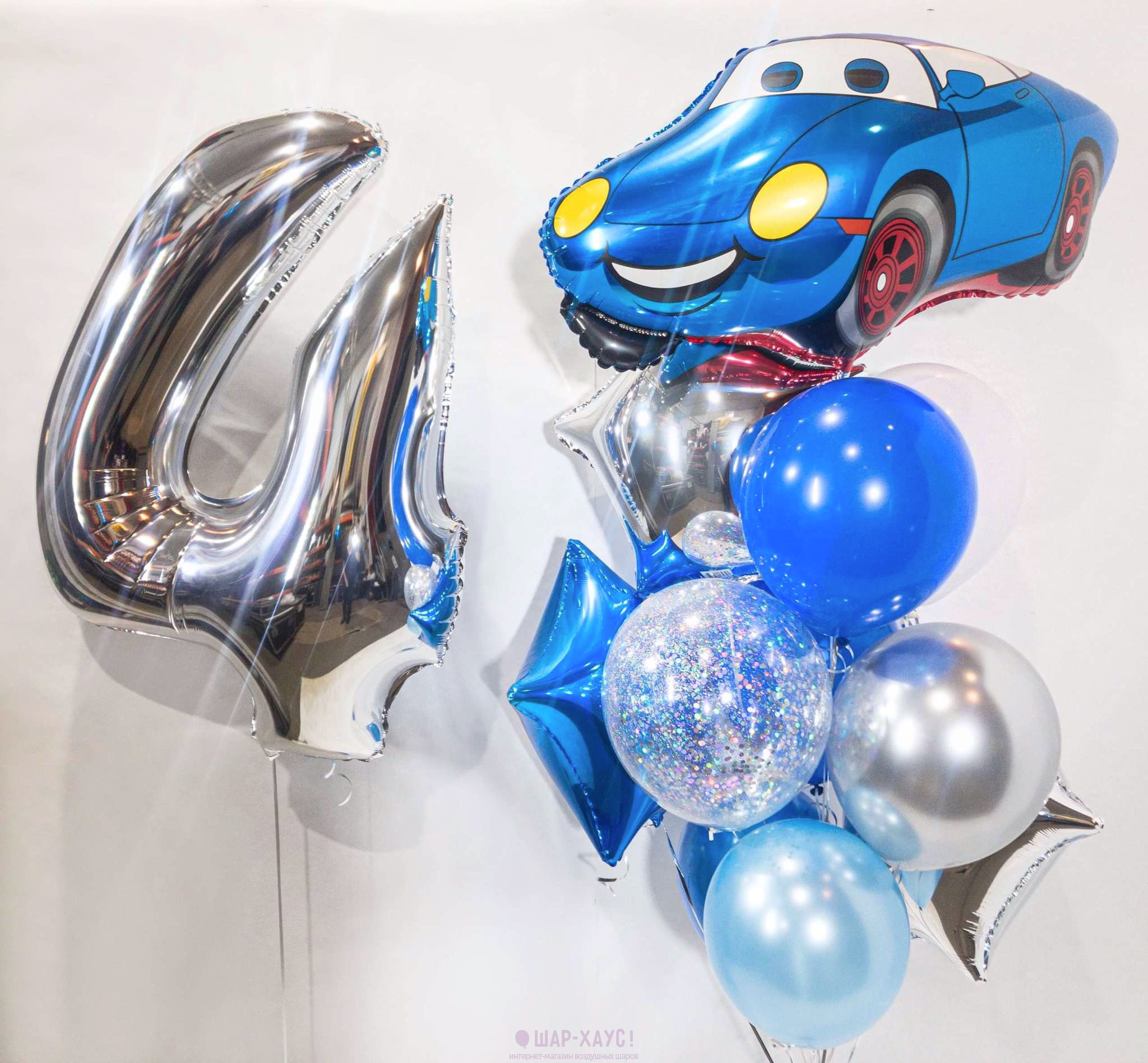 Композиция из шаров "Синяя тачка и цифра серебро"