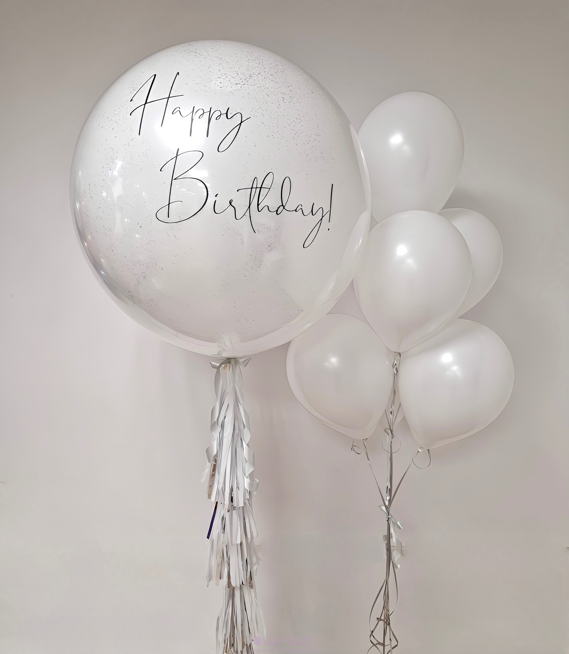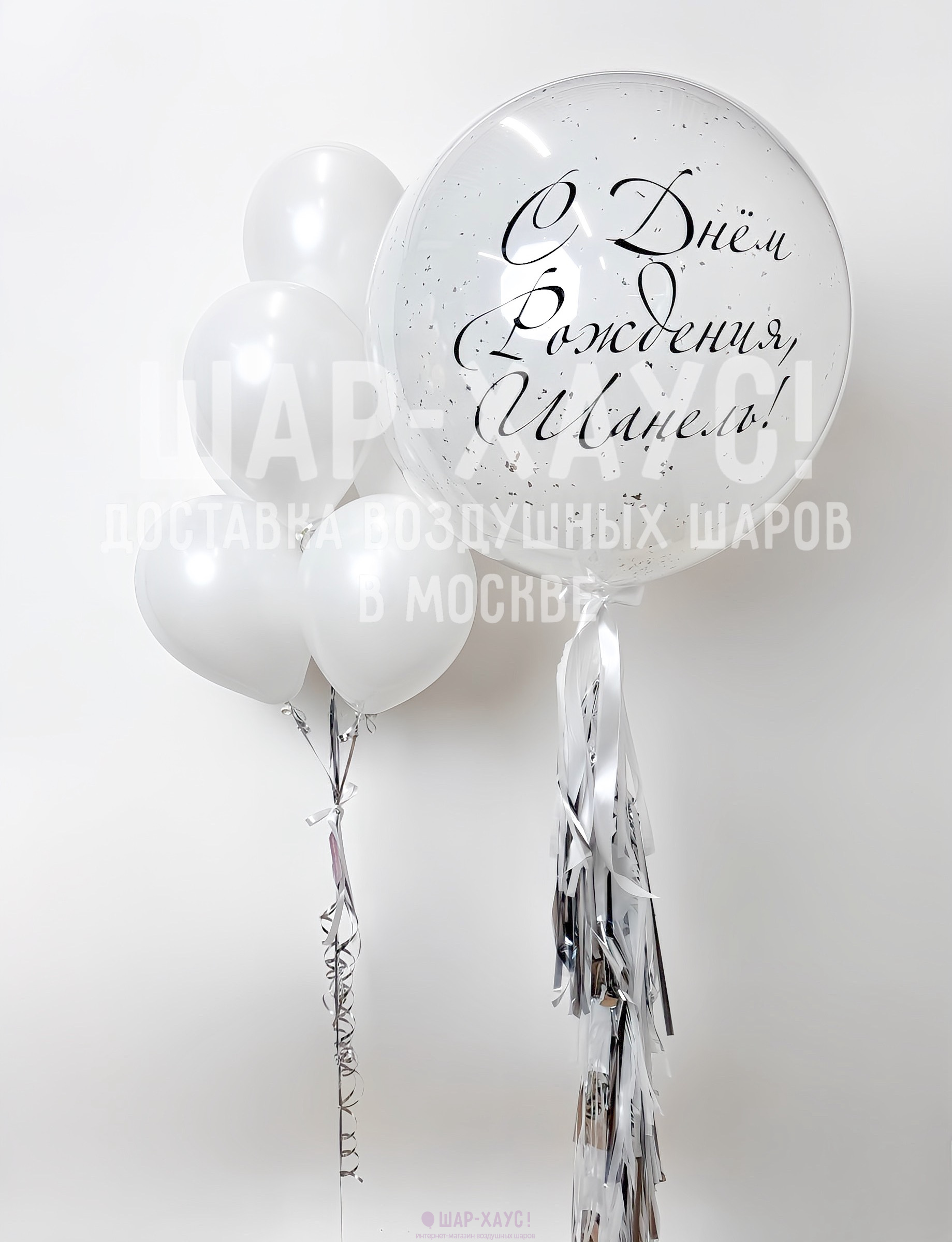 • 1 Стеклянный воздушный шар Дабл стафф с конфетти-крошкой внутри, гирляндой тассел и надписью на выбор (65 см)