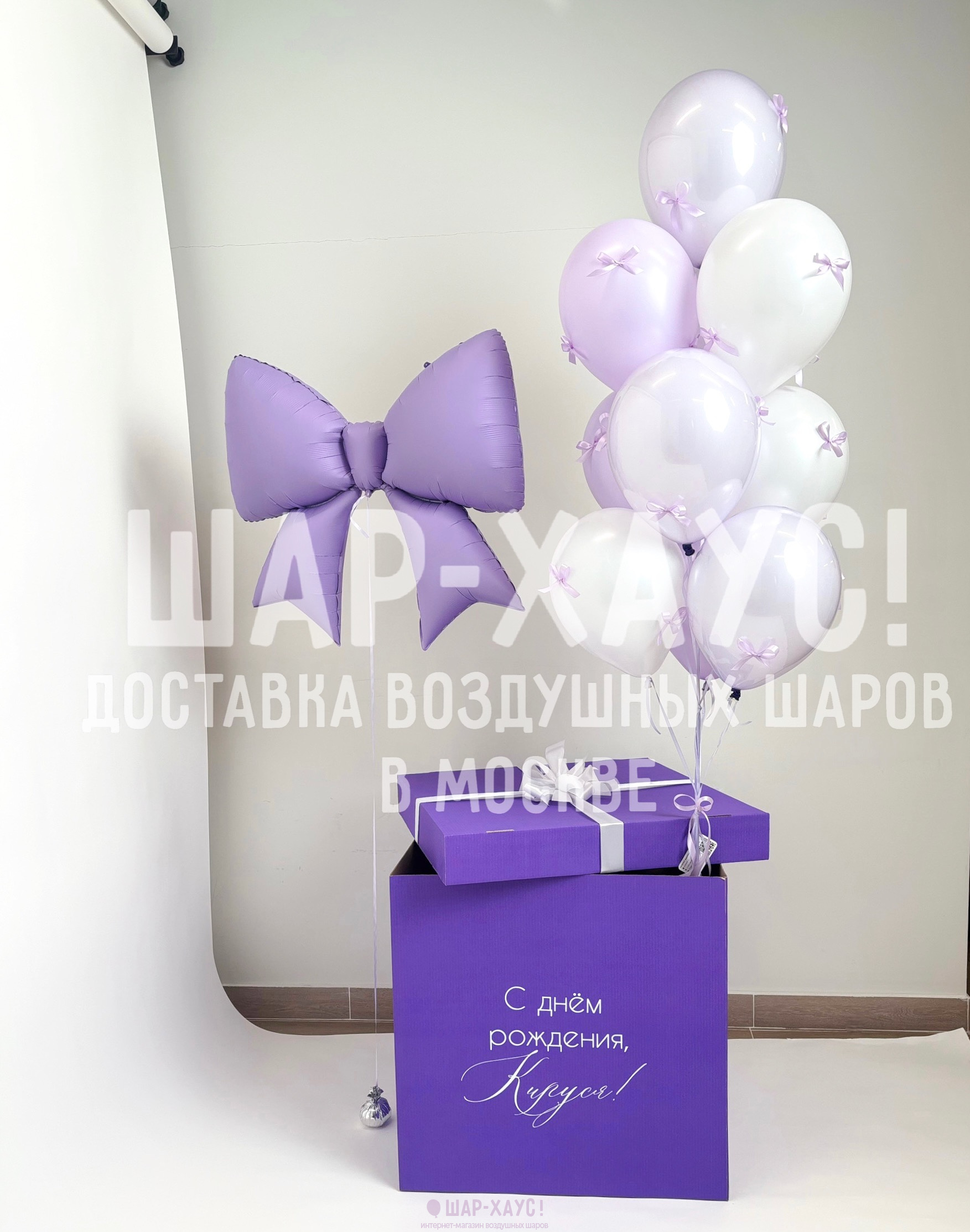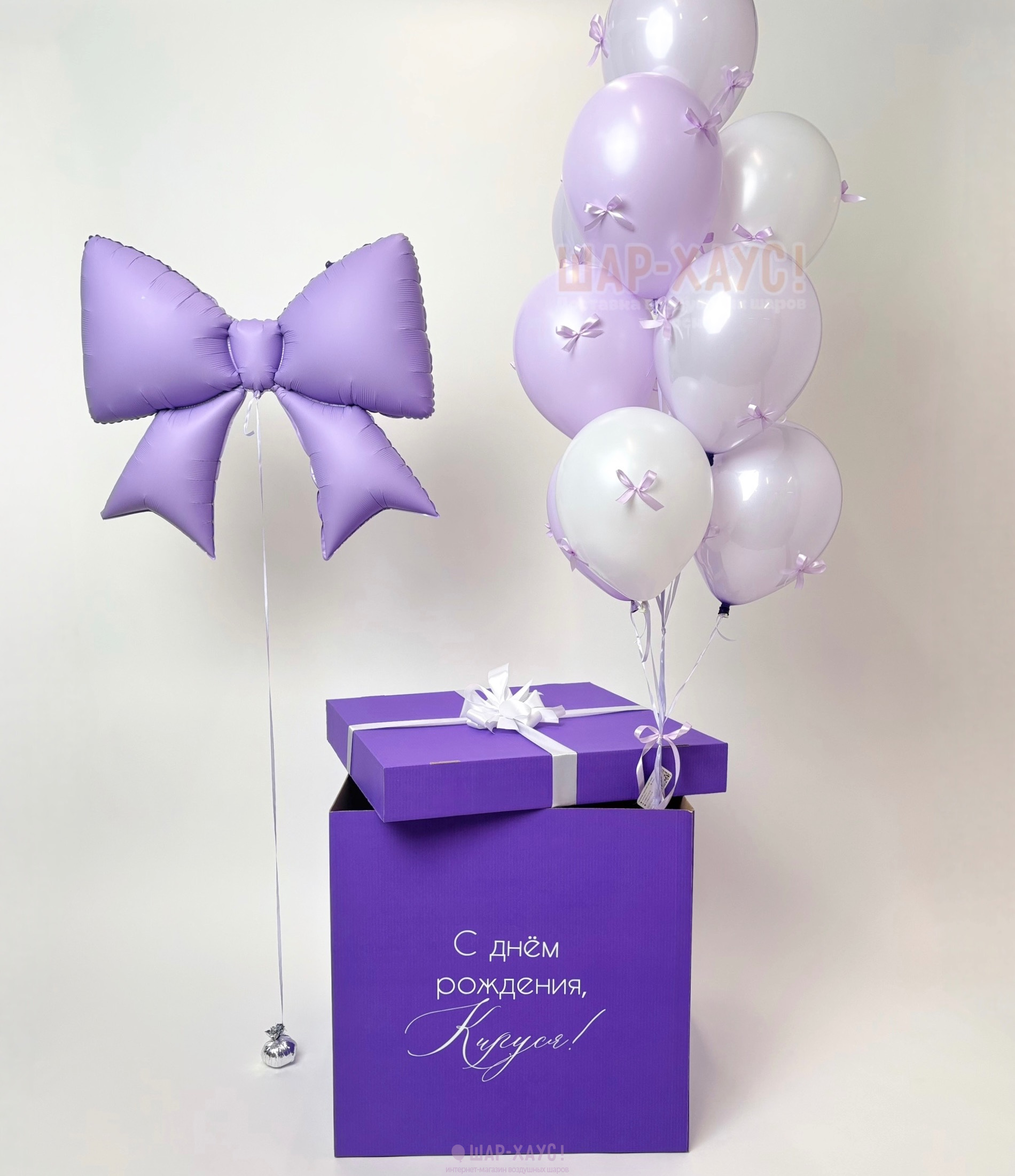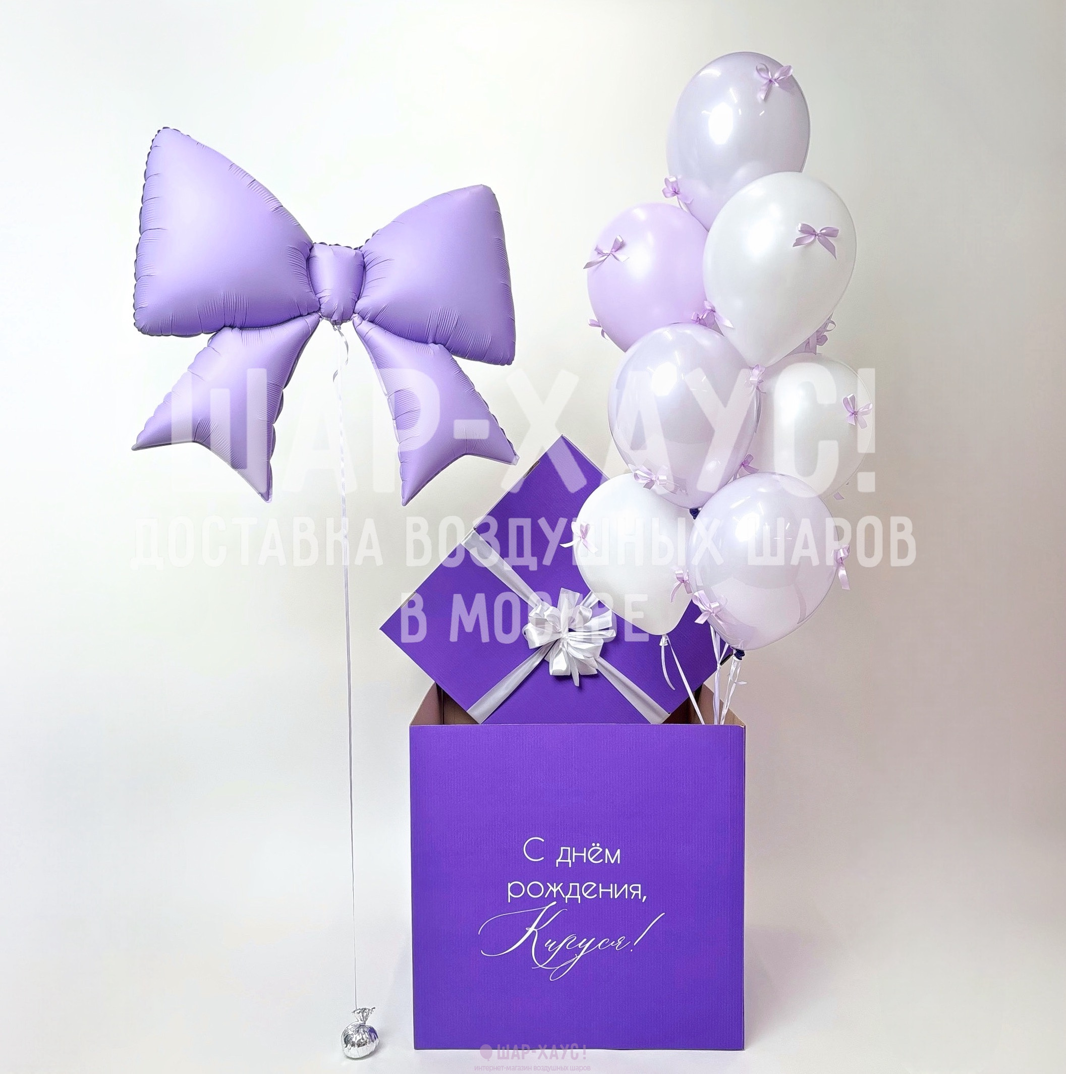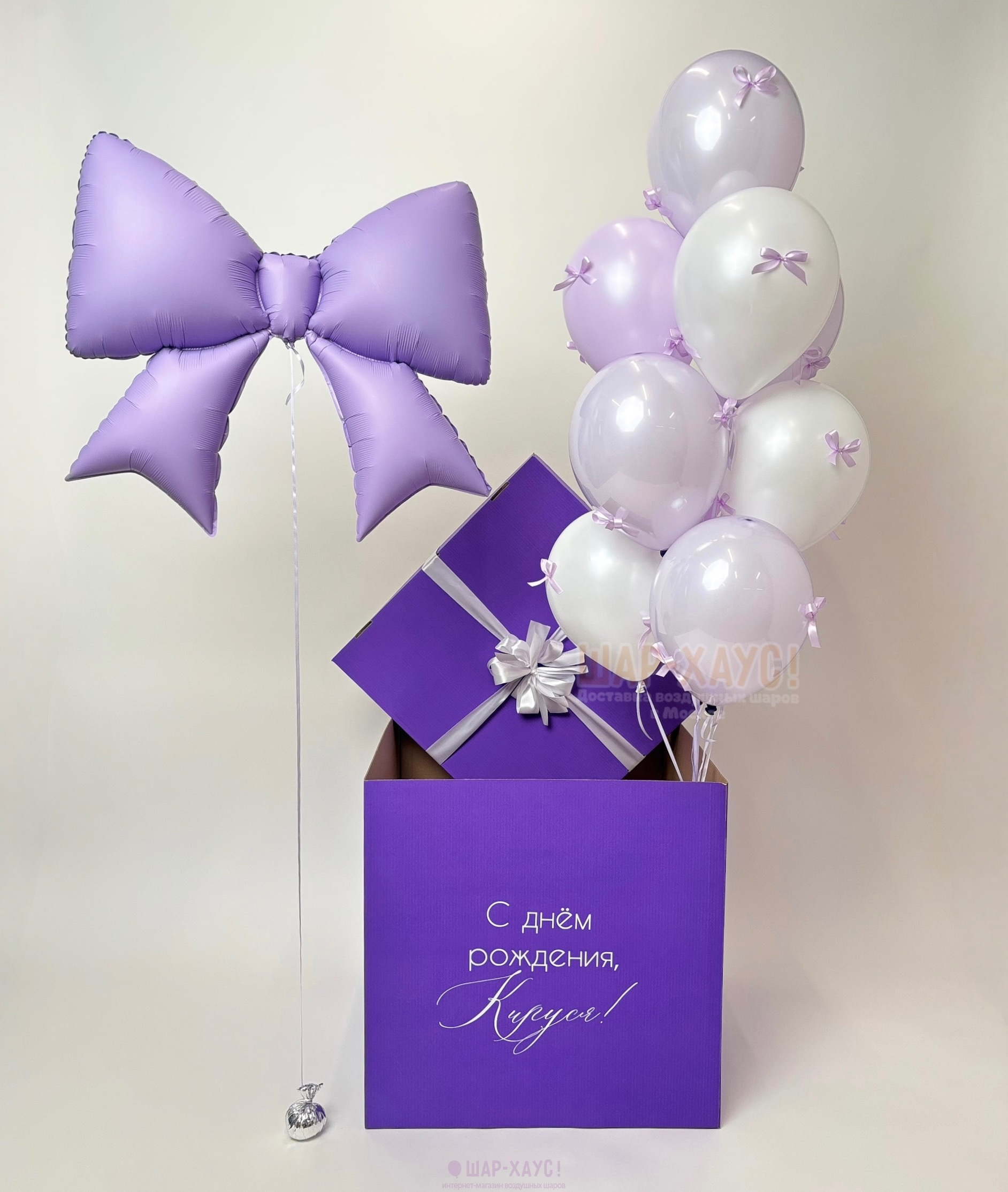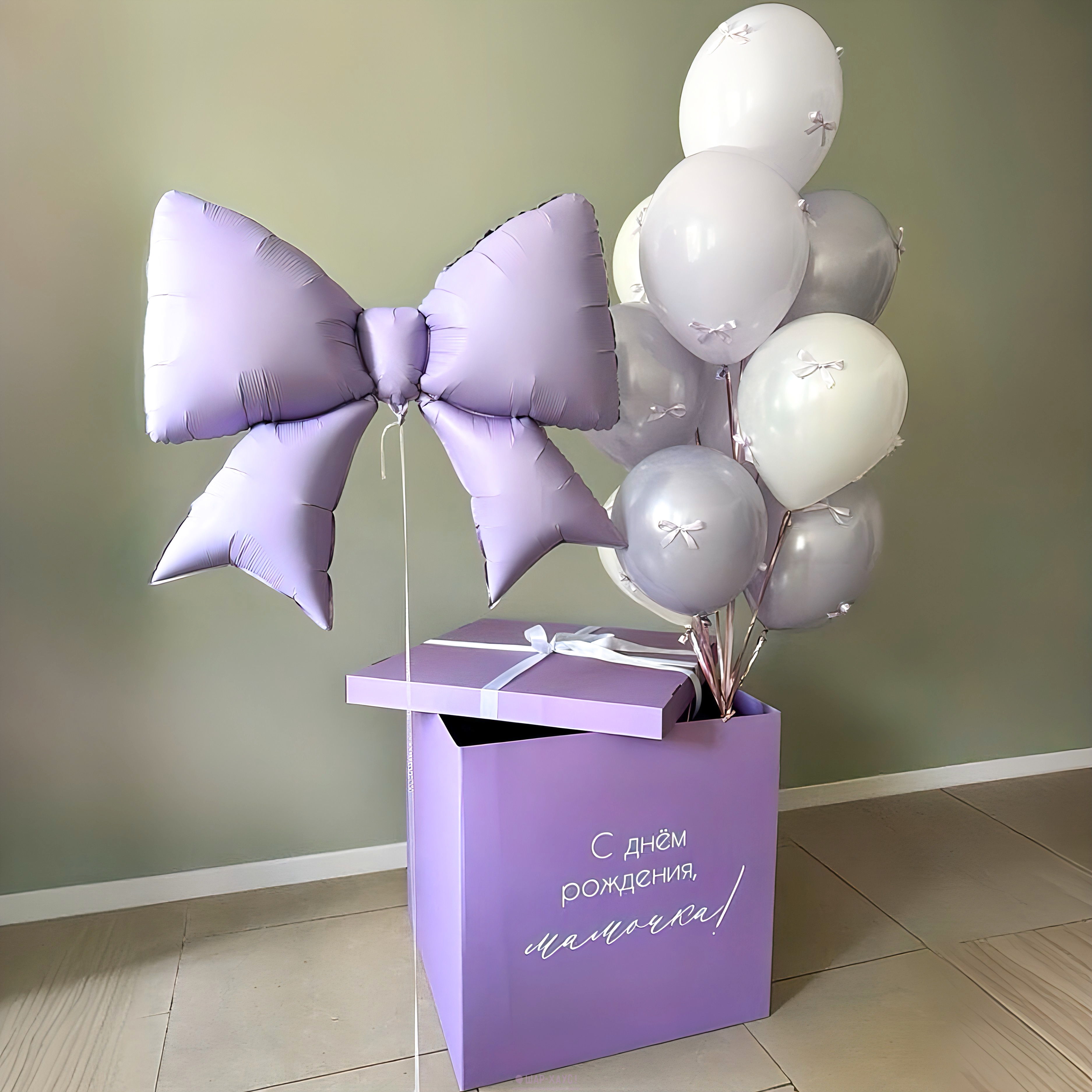 Коробка сюрприз с шарами "Сиреневый бантик"
