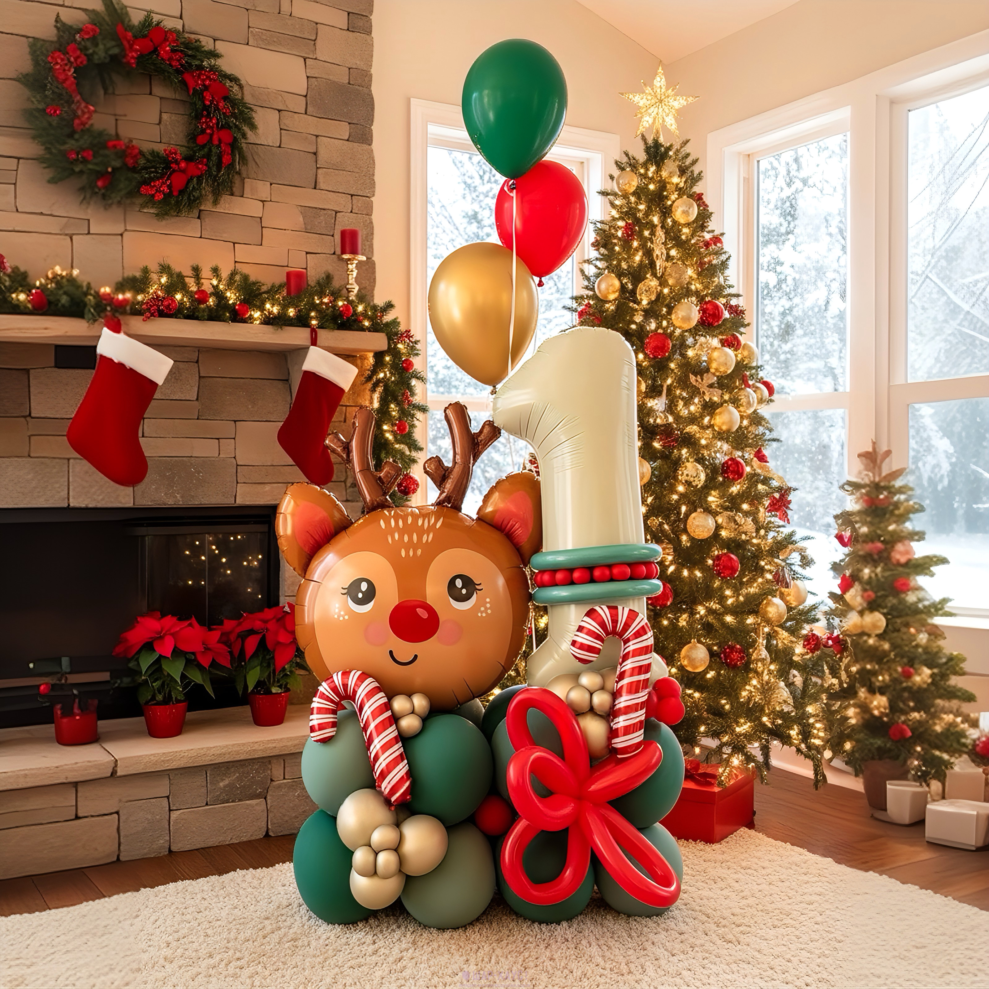 Новогодняя стойка из воздушных шаров с олененком и цифрой
